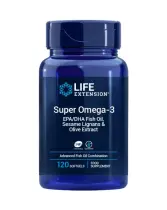 LifeExtension Super Omega-3, 120 kaps. on vahva Omega-3-valmiste, joka sisältää tarkkaan valikoidun sekoituksen EPA- & DHA-rasvahappojen lähteitä Super Omega-3 sisältää huippuunsa puhdistettua kalaöljyä Alaskanseidistä, seesaminsiemeniä sekä oliiviöljyuutetta. 2 kapselia tuotetta sisältää 2000 mg kalaöljyä, josta 700 mg on EPA:ta ja 500 mg DHA:ta - siis yhteensä 1200 mg näitä kaikkein tärkeimpiä rasvahappoja! Lisäksi tuote sisältää 300 mg oliiviuutetta ja 10 mg seesaminsiemenuutetta. Raaka-aineiden sisältämät omega-3-rasvahapot edistävät verenkiertojärjestelmän ja aivojen terveyttä ja vähentävät tulehdusta elimistössä.