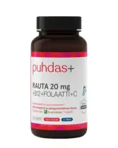 Puhdas+ Rauta 20 mg + B12 + Folaatti + C, 60 kaps. on vatsaystävällinen ja tehokas rautavalmiste, jossa yhdistyvät hyvin siedetty rautabisglysinaatti, raudan imeytymistä tehostava C-vitamiini, sekä verenmuodostusta tukevat B12-vitamiini ja aktiivimuotoinen Quatrefolic®-folaatti. Tuote on suunniteltu erityisesti henkilöille, jotka haluavat tukea jaksamistaan, punasolujen muodostumista ja raudan optimaalista imeytymistä ilman vatsavaivoja.