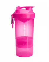 Smartshake Original 2Go -shaker sisältää kaksi erillistä säiliötä: pienempi, pohjaan kiinnittyvä säilytystila irroitettavalla jakajalla, jonka avulla jaat tilan helposti 4 erilliseen lokeroon esimerkiksi kapseleita ja tabletteja varten, & tilavampi lokero, johon mahtuu esimerkiksi reilumpi annos palautusjuomajauhetta. Irroitettava suodatinverkko takaa sen, että juomasta tulee samettisen pehmeää ja juomasekoituksiin ei pääse muodostumaan paakkuja. Shakerin kierrekansi pysyy kiinni tiiviisti, ja napsautettava korkki helpottaa ja nopeuttaa juomista. Kannessa on lisäksi kestävä karabiinihaka, jolla pullon voi kiinnittää esimerkiksi vyölle tai laukun ulkopuolelle, jolloin shaker ei vie tilaa treenikassin sisältä.